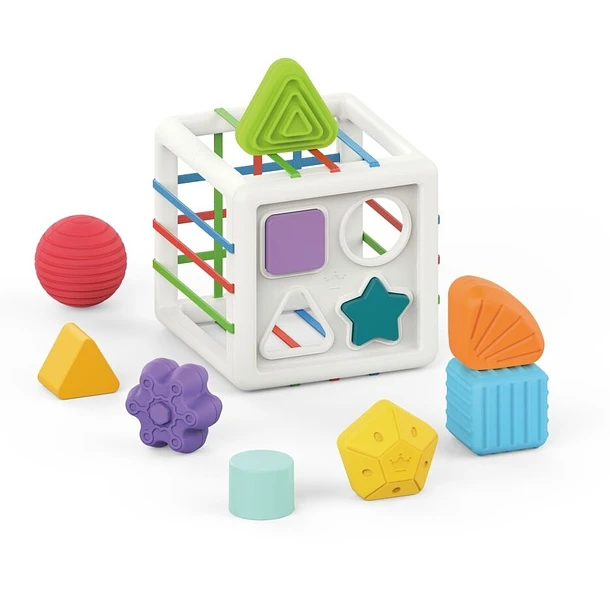 Las caras del cubo tienen bandas elásticas (desarrollo de la motricidad fina) y agujeros de diferentes formas (desarrollo motor y reconocimiento de formas).