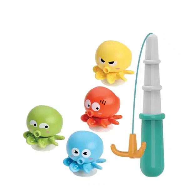 - Incluye 5 piezas, 4 coloridos pulpos giratorios con ventosas y una caña de pescar.