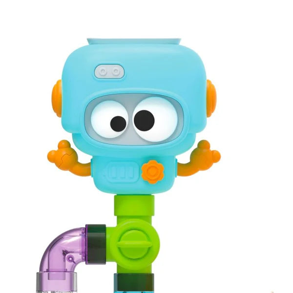 Este juego está diseñado para su uso en la bañera, permitiendo a los niños experimentar el flujo de agua y construir sus propios sistemas de tuberías. La presión del agua se controla girando las válvulas, brindando a los niños la oportunidad de jugar con combinaciones divertidas, además pueden aprender conocimientos sencillos sobre el movimiento mecánico llenando el robot con agua para hacer girar sus ojos, la hélice y crear una cascada.