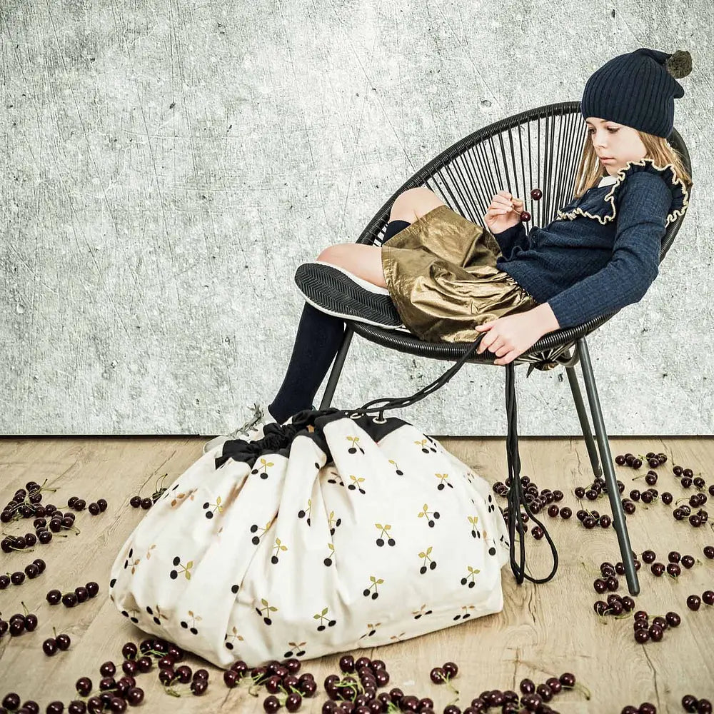 La bolsa Play&Go® es una solución sencilla, efectiva y divertida para el almacenaje de juguetes. Una bolsa 2 en 1 para guardar los juguetes y que se transforma en alfombra de juegos, es el sueño de todos los niños. P&G Cheerry Gold es un especatacular tapete de juego y bolsa de almacenamiento 2 en 1, con estampados de cerezas doradas.Sumérgete a ti y a tu pequeño en un tapiz de tonos intensos y patrones cautivadores. La alfombra de juego despliega un reino de posibilidades imaginativas, proporcionando un lienzo para explorar formas, sumergirse en colores y tejer historias que cobran vida. Construye nuevos universos, enciende el pensamiento inventivo e infunde cada momento con risas desenfrenadas. Sin embargo, hay más por descubrir: esta creación ingeniosamente diseñada cumple una doble función. A medida que el día se acerca a su fin y el tiempo de juego concluye, transforma sin problemas la alfombra de juego en una cómoda bolsa de almacenamiento. Organiza sin esfuerzo guardando juguetes y tesoros, revelando un santuario despejado en cuestión de minutos.