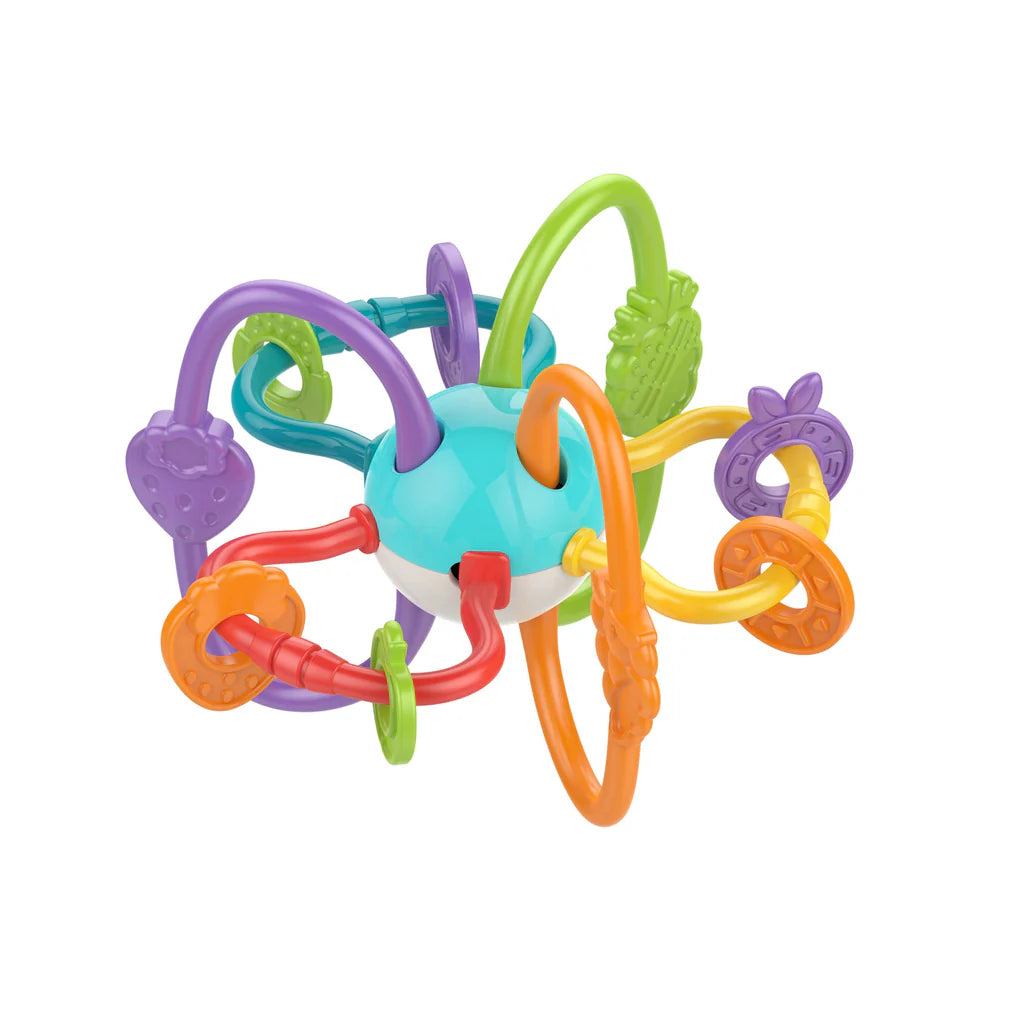 Sonajero y mordedor molar para entretener y cuidar a los infantes al momento de salir los primeros dientes. Su laberinto de tubos suaves, continuos y colores deslumbrantes captura y retiene instantáneamente la atención de los pequeños.