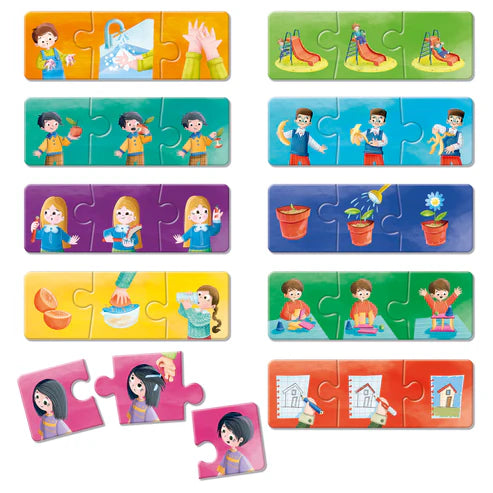 Un juego educativo para estimular el pensamiento lógico y aprender a agrupar y clasificar. El niño observa y compara varios elementos realizando las primeras clasificaciones y asociando las piezas a imágenes con características comunes.