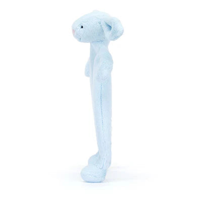 El conejito tiene las típicas orejas largas caídas, una nariz de gamuza rosa y ojos bordados. Su cuerpo no tiene relleno y sus patas, delicadamente blandas con pies en forma de bola, facilitan que las pequeñas manos de nuestros niños lo puedan sostener fácilmente.